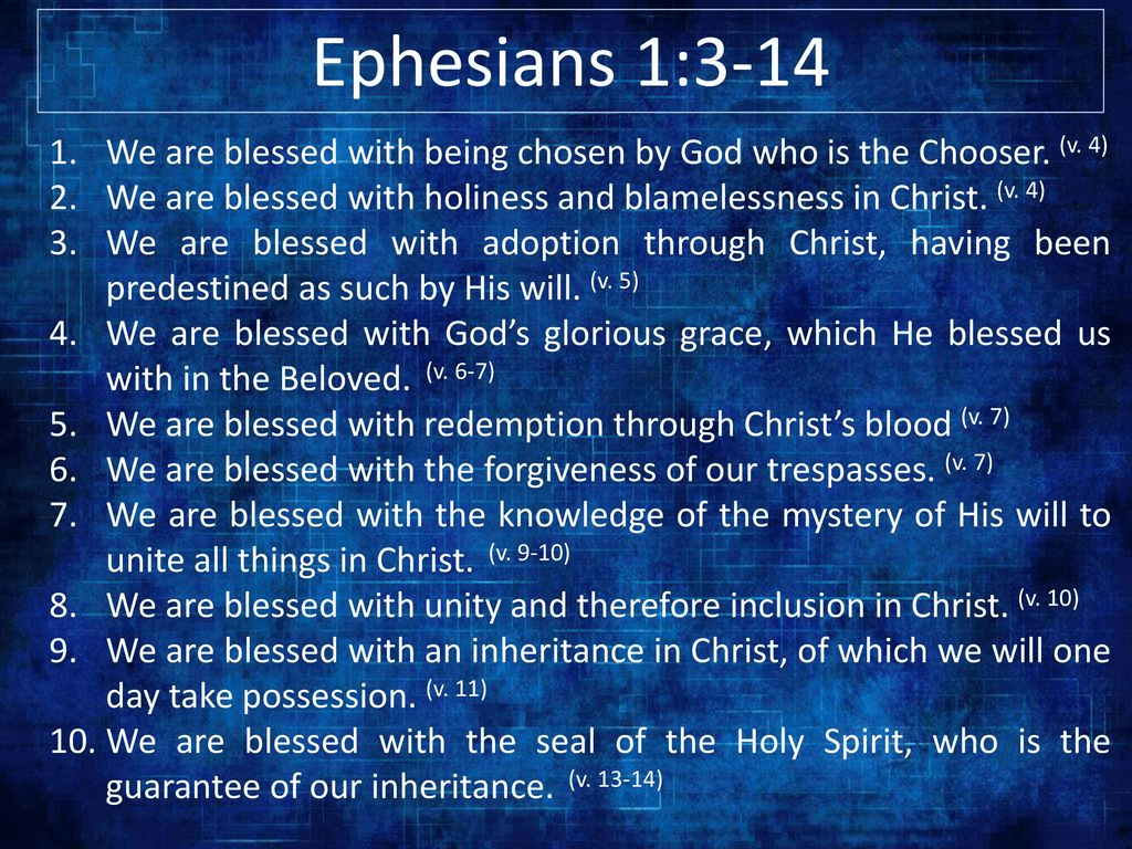 Before we get into the controversial issues in this section, just look at that list of spiritual blessings and rejoice in what God has done for you (if you are a sincere, faithful believer). Using the numbers in the image above:
