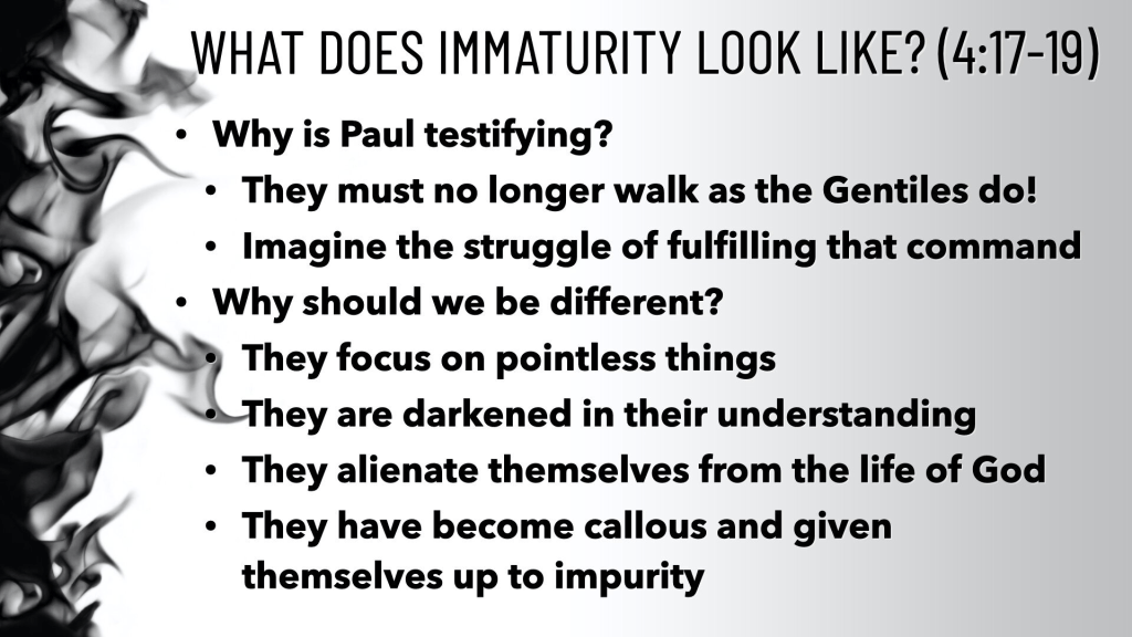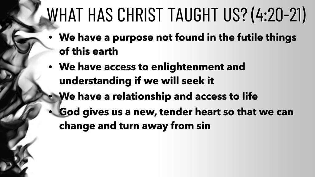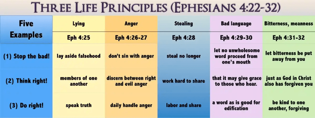 4:30 A key verse in the midst of this. 30 And do not grieve the Holy Spirit of God, by whom you were sealed for the day of redemption. The Holy Spirit is constantly working to help us (through the written word and other ways) to do all this. Just like parents are constantly trying to instill these life principles in their children and it grieves them when their children do wrong and don’t do right. It grieves the Holy Spirit when we don’t.
