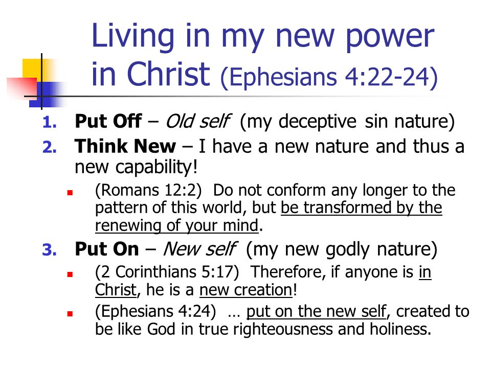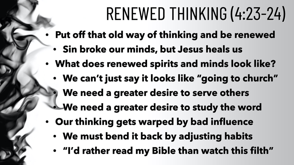 4:25-32 But what does that mean to put off the old self and put on the new self. Let’s get specific on what to put off and what to put on.
