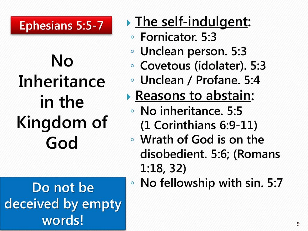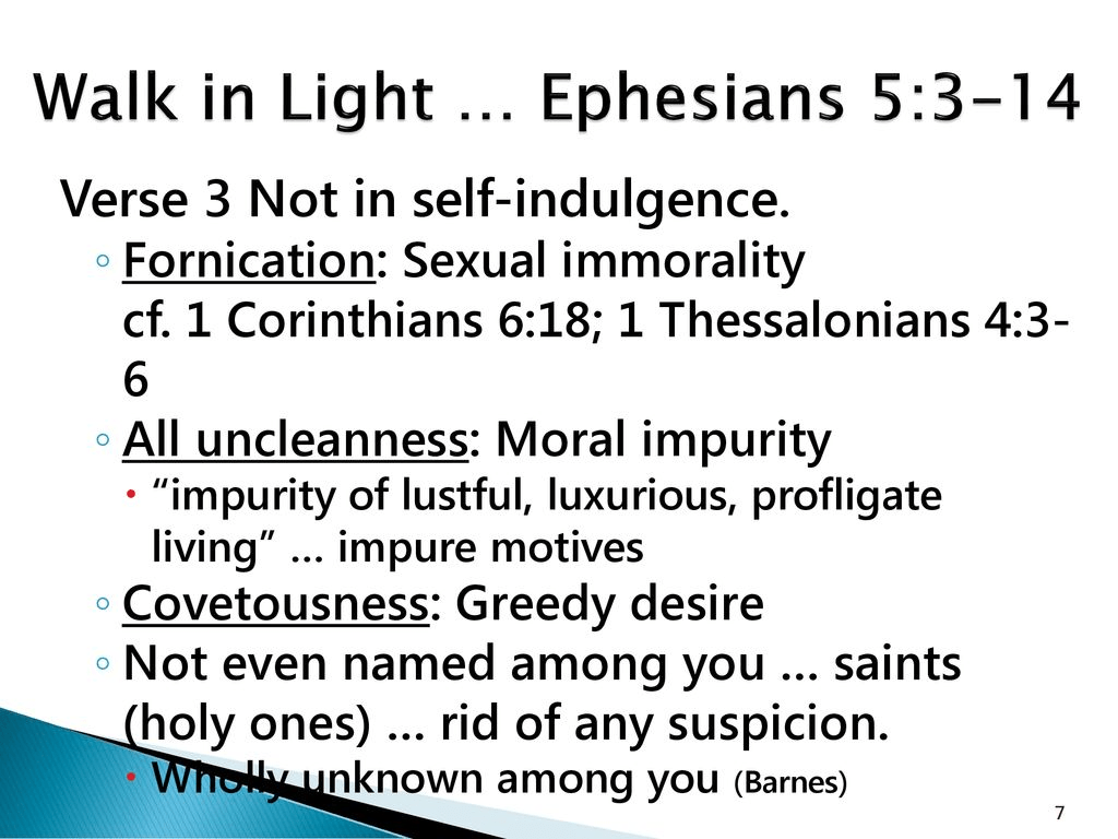 Q: 5:3,5 The two main sins of the darkness are sexual immorality and greed (covetousness). “Filthiness, foolish talk, and crude jesting” are probably connected to those two main sins.