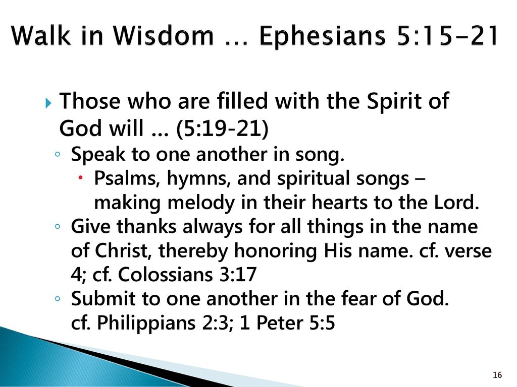 Q: 4:19 Being filled with the Spirit leads to singing psalms, hymns, and spiritual songs, singing and making melody in our hearts to the Lord, teaching and admonishing one another (Colossians 3:16).
