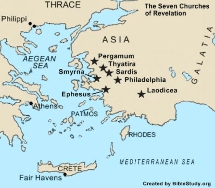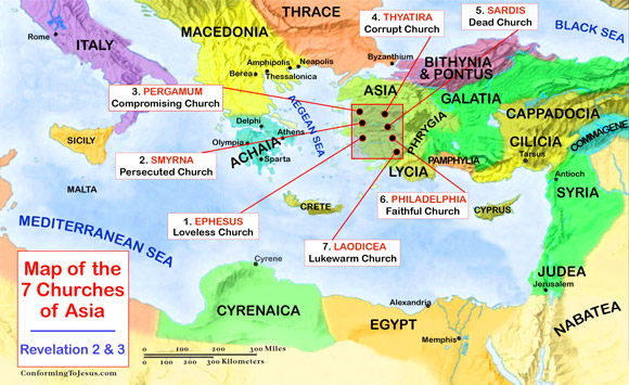 - It was written to the 7 churches of Asia (ch 1-3). The map below gives a nickname to each of the 7 churches. Read ch 2-3 and see why each church is called by that nickname.
