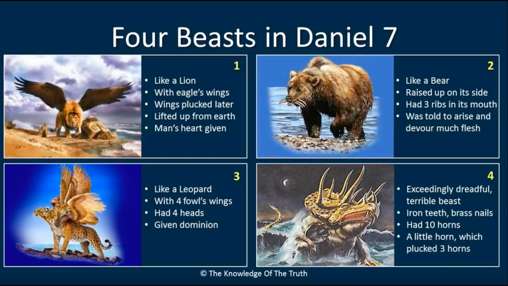 - Other figures like the sea beast of ch 13 are taken from OT predictions (Daniel 7 names the next 4 kingdoms: Babylon, Medo-Persia, Greeks, Romans) using lion, leopard, and bear, the same figures used to describe the sea beast Rome in ch 13 (the iron beast in Daniel 2,7). Surely the readers of the letter would connect Daniel 7 animals with the Revelation 13 sea beast.