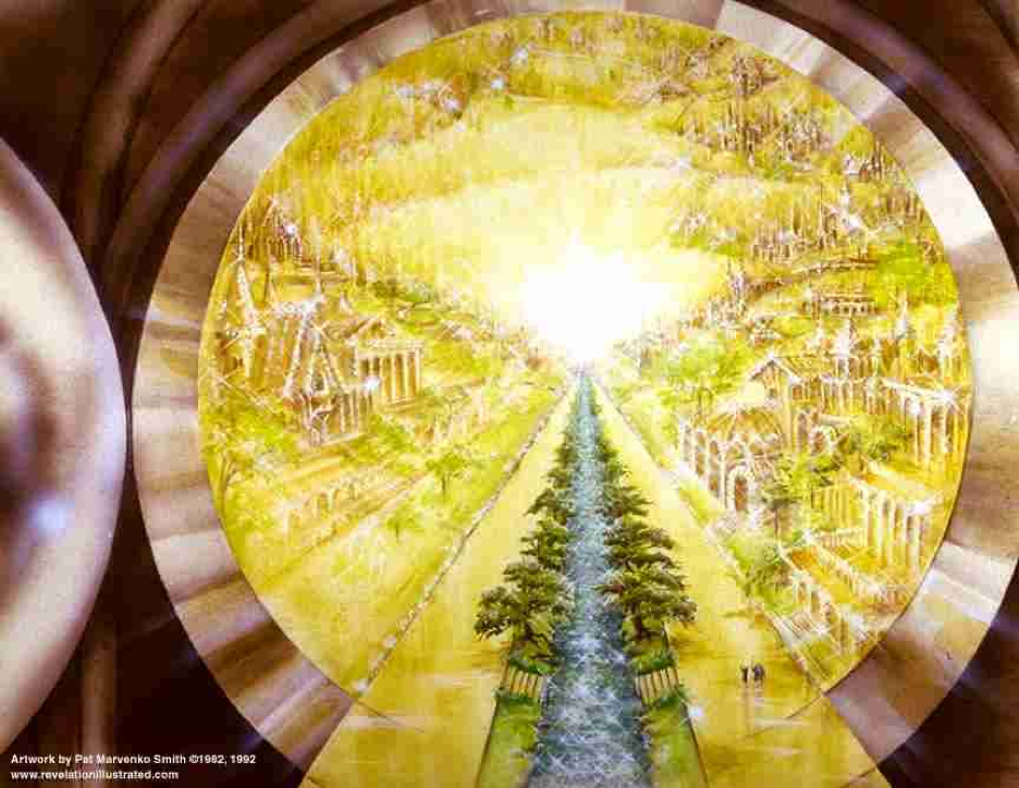 - Ch 22 picture a river flowing from the new Jerusalem with the water of life and the tree of life with leaves for the healing of the nations.