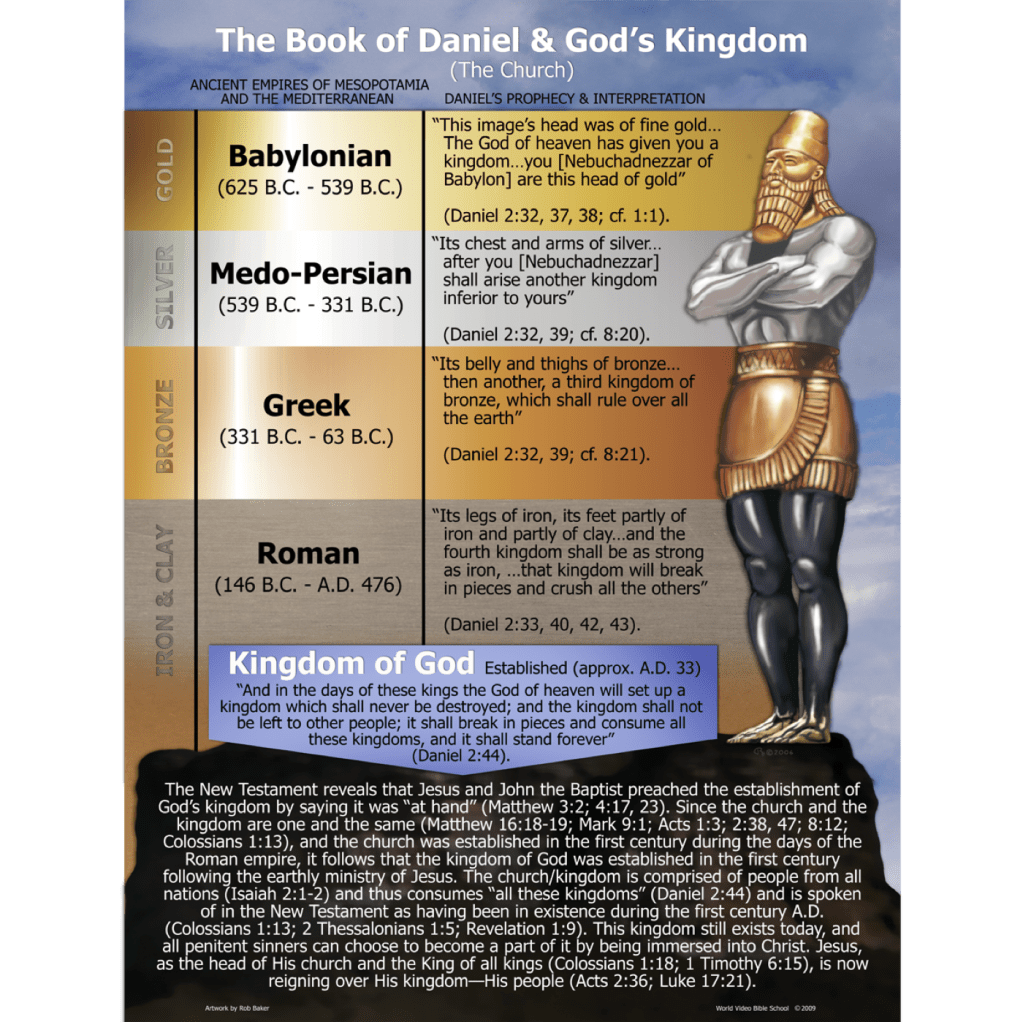 4) The Roman Empire (168BC-476AD) will be the legs of iron. We know this b/c Daniel 2:44-45 says that in this 4th empire that God would set up his kingdom. Jesus came preaching that the “kingdom of heaven is at hand” (the same kingdom predicted in Daniel 2:44-45). Mark 9:1 Jesus said that some of those listening to him would still be alive to see him coming in his kiingdom. Mt 16:18-19 Jesus told Peter, “upon this rock I will build my church…I will give you the keys of the kingdom of heaven”. Peter used those keys to open the kingdom to those 3,000 baptized in Acts 2 and they were added to the church, the spiritual body of Christ. The kingdom at hand was the church kingdom established in the book of Acts in the 1st century. Rome was the world power when Jesus said that, so Rome would have to be the 4th kingdom legs of iron that was ruling the world when that prediction was fulfilled.