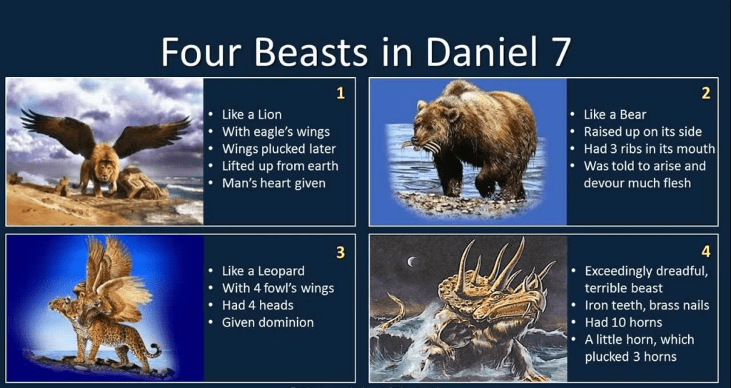 In Revelation 13 a beast with 10 horns arises out of the sea that has lion, bear, and leopard traits. Rev 13:1 “And I saw a beast rising out of the sea, with ten horns and seven heads, with ten diadems on its horns and blasphemous names on its heads. 2 And the beast that I saw was like a leopard; its feet were like a bear’s, and its mouth was like a lion’s mouth.” That this was the same imagery from Daniel 7 would be obvious to the readers of Revelation, and the sea beast would be identified as the Roman Empire.