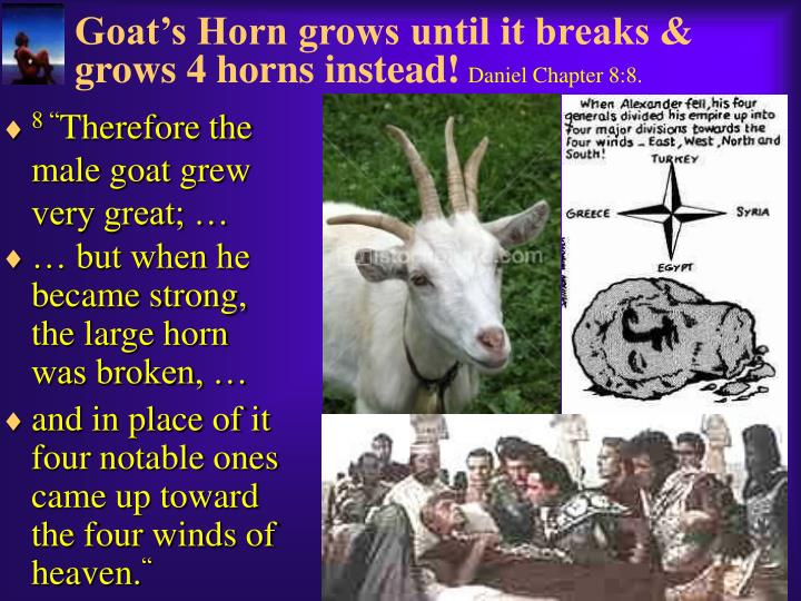 Again, look at the statue. Gabriel even tells Daniel that the ram is Media/Persia (the 2nd kingdom) and the goat is Greece (the 3rd kingdom) with a conspicuous horn, Alexander the Great. The goat attacks the ram and tramples it under its feet. This vision speak of a “small horn” magnifying itself to be equal to the Commander of Hosts (God) and trampling the holy place (the temple) and the host (the Jews), which would fit Titus again, the little horn of ch 7. It also says that the holy place will be restored in 2300 evenings and mornings, which is the prophecy William Miller wrongly interpreted to be the return of Jesus in 1843 AD. The vision pertains to the “time of the end” which is the end of the Jewish Age at 70 AD. The small horn even opposes the Prince of princes, i.e. Jesus, in some way. Titus sought to destroy all Jews, Christian and non-Christian in 70 AD. Many try to say that this small horn of Daniel 8 was Antiochus Epiphanes, the Syrian king who polluted the temple with pig stew and killed many Jews, but he can’t be the samll horn b/c 1) This vision was about the time of the end, i.e. end of the age in 70 AD; 2) Antiochus did not oppose the Prince of princes, i.e. Jesus. The small horn of Daniel 8 and the little horn of Daniel 7 are the same and fulfilled in Titus.
