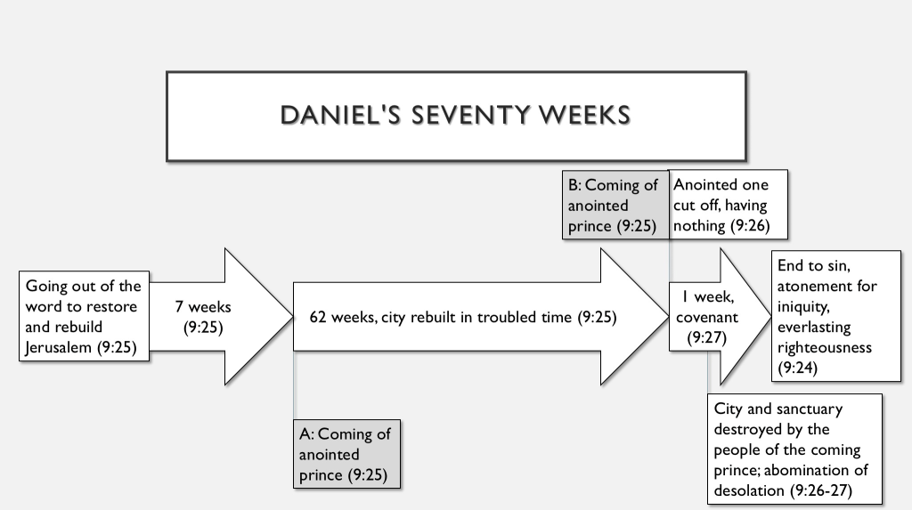 The preterist view considers the prophecy to have been fulfilled by AD 70. By interpreting the “weeks” symbolically, preterists have more flexibility in determining the dates of the events predicted. They understand the “word to rebuild Jerusalem” as the decree of Persian king Cyrus in 538 BC. The “anointed one” in both v. 25 and v. 26 is Jesus, who is also regarded as the one who confirms the “strong covenant” of v. 27, and whose atoning work rendered the Jewish sacrifices obsolete and even abominable to God. Titus is the “prince to come,” whose armies destroyed the Jewish Temple in Jerusalem. Here’s what it looks like: