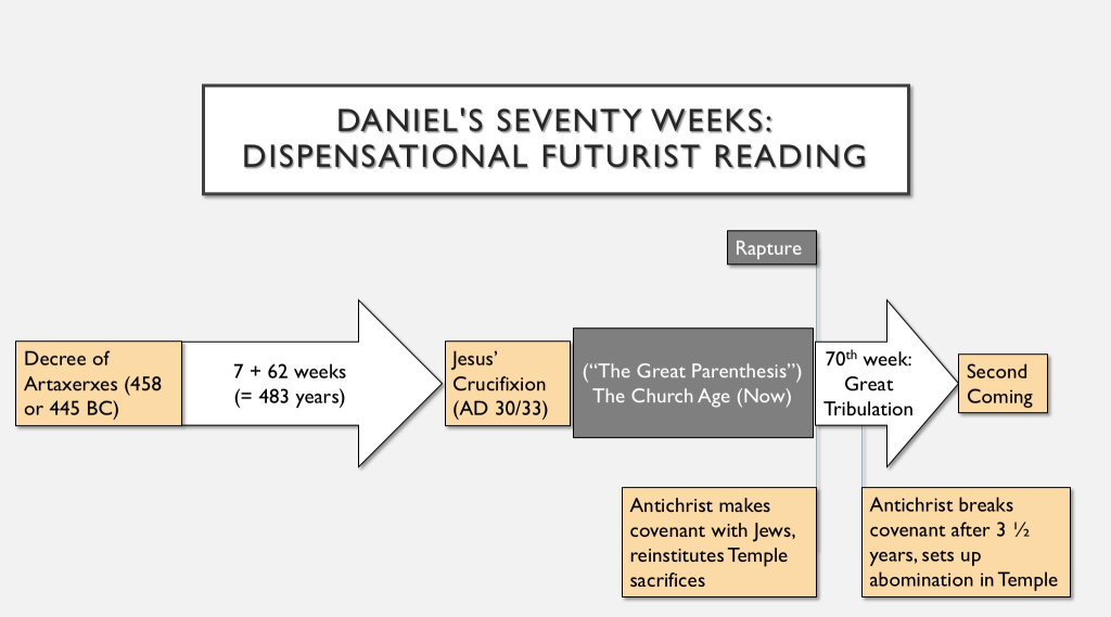 The dispensationalist view (which is wrong bc the 70th week ended in 70 AD) distinguishes between those prophecies pertaining to the nation of Israel (including Daniel 9:24-27) and those pertaining to the Christian church. It interprets the weeks the most literally, as exact seven-year periods. By starting with one of the decrees of the Persian king Artaxerxes—either in 458 BC (Ezra 7:11-26) if one uses a 365-day calendar, or in 445 BC (Neh. 2:1-8) if one uses a 360-day calendar—one can arrive at the Crucifixion of Christ in 33 AD for the end of the sixty-ninth week. However, the events of the seventieth week clearly did not take place in the seven years following Christ’s death, which is why dispensationalists posit a “gap” between the sixty-ninth and seventieth week. They often call this the “Great Parenthesis,” which corresponds to the current church age. The Parenthesis (unforeseen by Daniel) will come to an end with the Rapture (also unforeseen by Daniel), which will then lead into the seven-year Great Tribulation, during which time the Antichrist will make a pact with the nation of Israel, only to break it after 3 1/2 years and desecrate the rebuilt Temple. Here’s what it looks like: