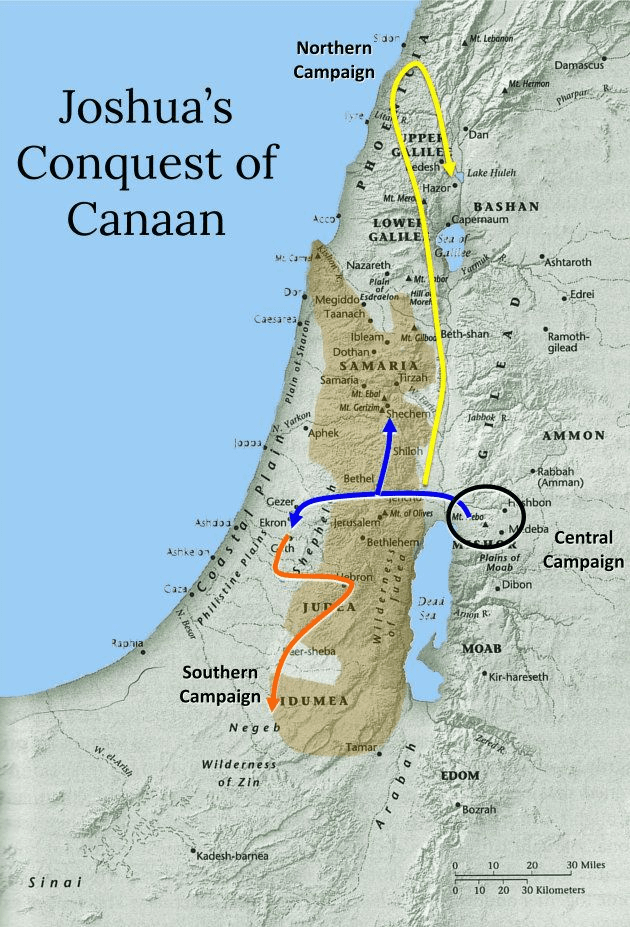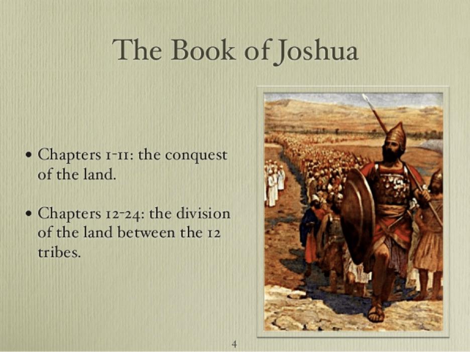 God had promised Abraham the land of Canaan (Gen 12:1-3) and repeated that promise to Isaac and Jacob. God told Abraham that his descendants would be in slavery in a foreign land for 400 years (Gen 15:13-16) before they would come out and occupy the land. Moses led them out of slavery, but was not allowed to go into Canaan. He appointed Joshua to lead them into Canaan. In about 7 years, Israel defeated all the major forces of the cities of Canaan, starting with Jericho in the central part, then the conquest of southern Canaan, and finally the conquest of northern Canaan. The land was divided between the 12 tribes. The Levites received 48 Levitical cities (ch 21) spread throughout the land so they could teach the Law to all 12 tribes, but they did not get a “tribe portion” of the land. Instead, the 2 sons of Joseph, Ephraim and Manasseh, received a “tribe portion” of the land since Jacob had ultimately given Joseph the firstborn portion (Gen 48:21,22) which means that he would receive twice as much land as his brothers. There were 6 cities of refuge (ch 20). The 12 tribes then went to their respective parts of the land, and were commanded to finish utterly destroying the Canaanites. They did not utterly destroy them, but they did possess the land such that Joshua 21:43-45 says, “So the Lord gave Israel all the land which He had sworn to give to their fathers, and they possessed it and lived in it. Not one of the good promises which the Lord had made to the house of Israel failed; all came to pass.”