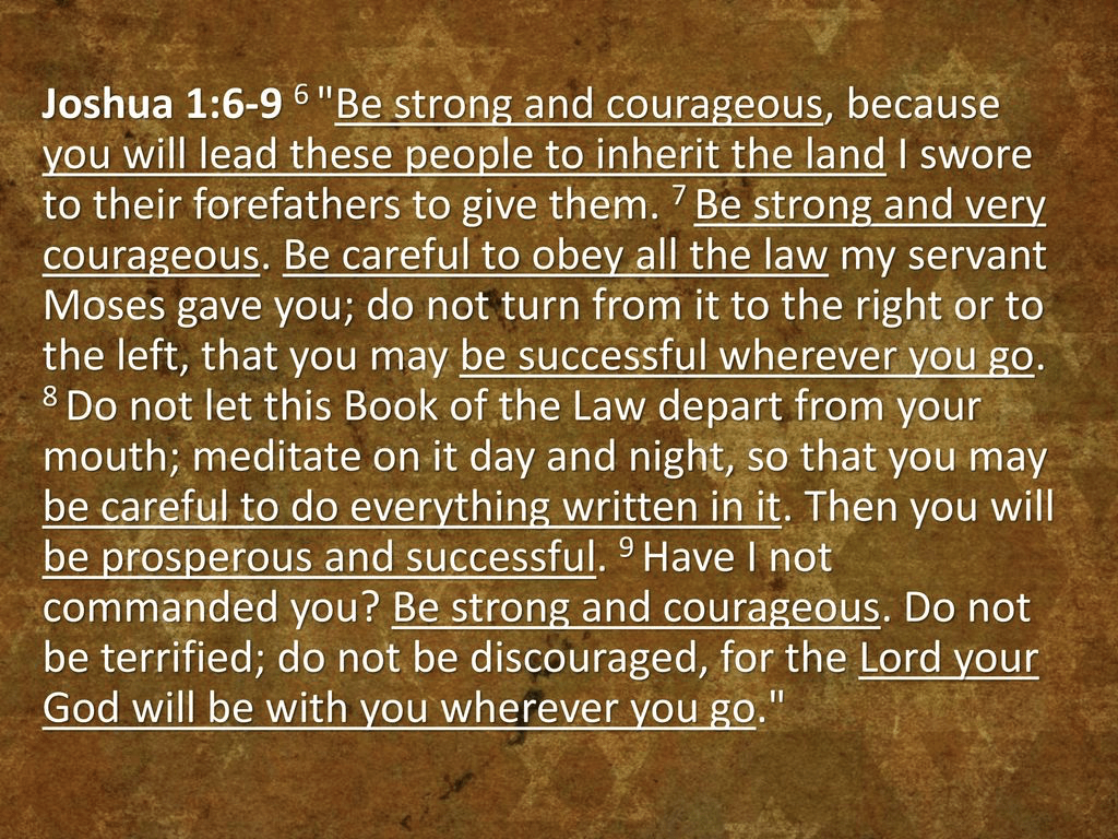 God commands Joshua to be strong and courageous. There are giants in the land and each city has an army to defend it. But God promises to be with him and give him success.