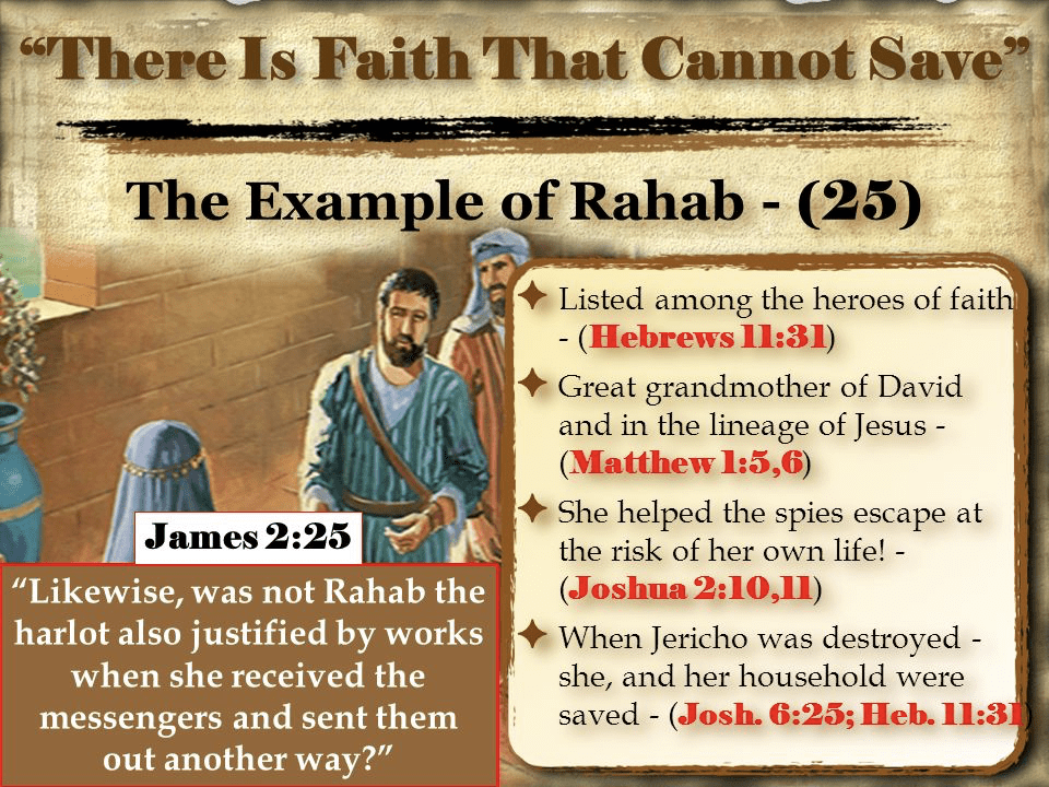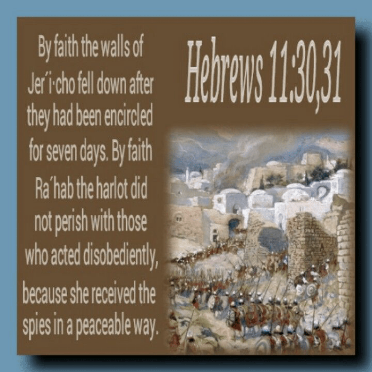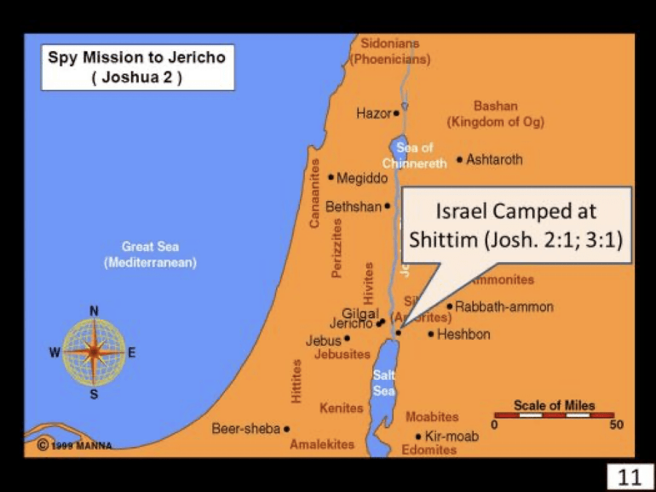 The 2 Israelite spies enter Jericho and meet Rahab, a prositute. She tells them how terrified the people are of Israel and their god, YHWH. They all had heard how YHWH defeated all the gods of Egypt in the 10 plagues and the drowning of Pharoah’s army in the Red Sea. She is ready to put her trust in the one true God of Israel, YHWH. BTW that tells us that every Canaanite had the same opportunity to turn from their false gods and turn to YHWH, but only Rahab did. God was just in wiping out the Canaanites due to their idolatry even though it seems like genocide to. us. The spies promises to spare her family.