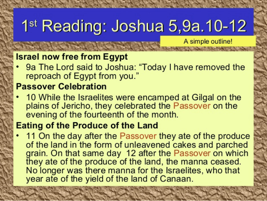 Those men born during the 40 years in the wilderness had not been circumcised, so Israel paused to circumcise them even though that would leave them vulnerable to attack from the Canaanites (as Simeon and Levi attacked and killed the Shechemites after they had been circumcised. The place where they were circumcised is named, Gibeath Haaraloth translated as the “hill of foreskins.” They celebrate the Passover and start eating the produce of the land. The supply of manna that sustained them in the wilderness for 40 years ceases.