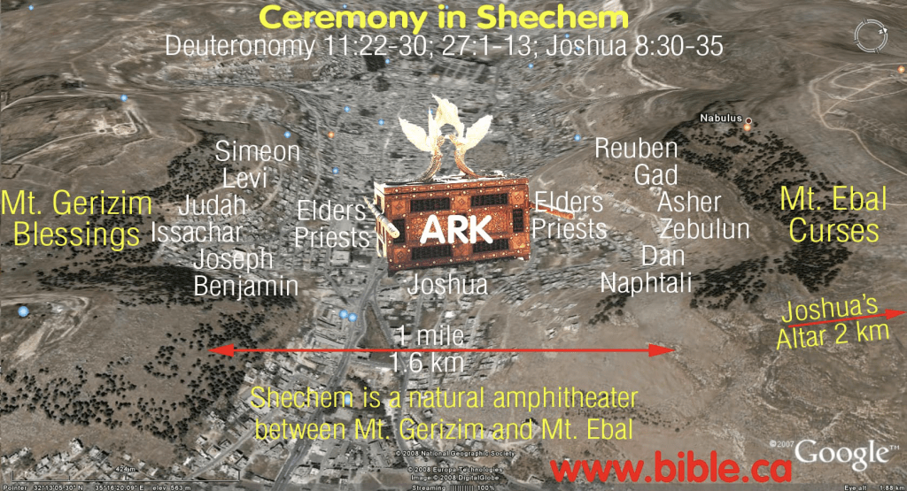 The Israelites fulfill Moses’ instructions God had given Moses in Deuteronomy 27 to hold a covenant renewal ceremony at Mount Ebal and Mount Gerizim. 6 of the tribes read the curses of disobedience from Mt. Ebal and the other 6 tribes read the blessings of obedience from Mt Gerizim. Joshua builds an altar of unhewn stones at Shechem, and the priests offer sacrifices. Joshua cuts out a copy of the law of Moses in stone and reads it to the Israelites.