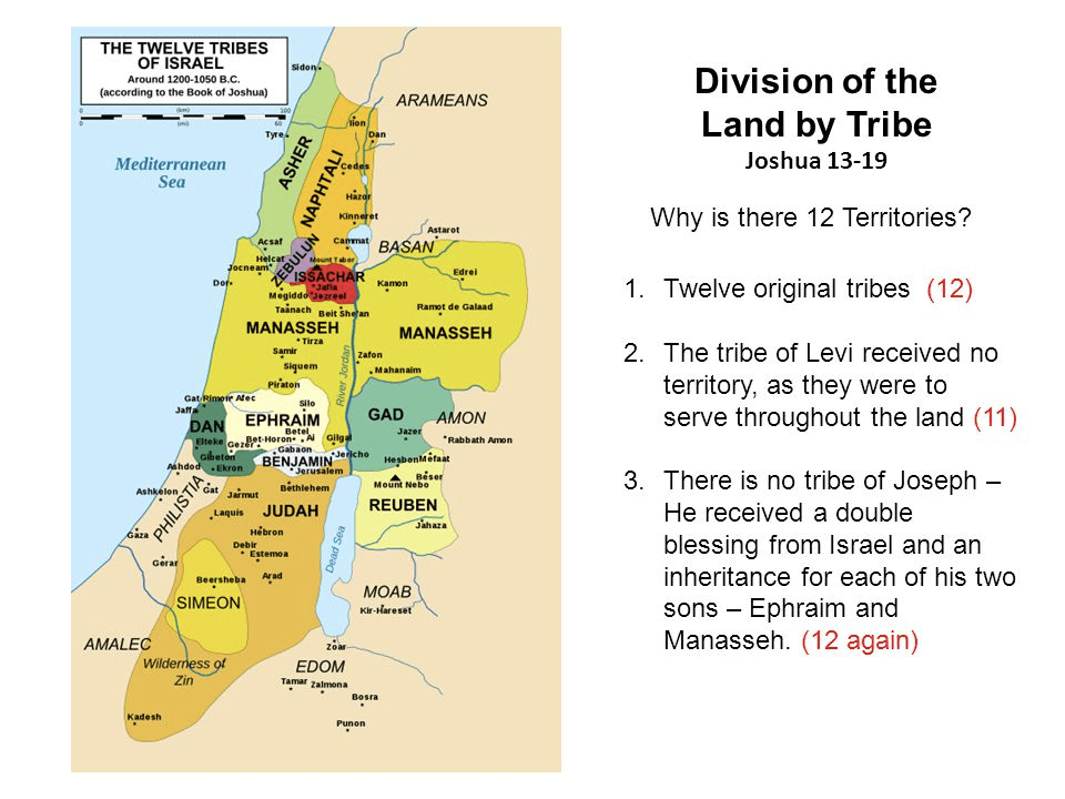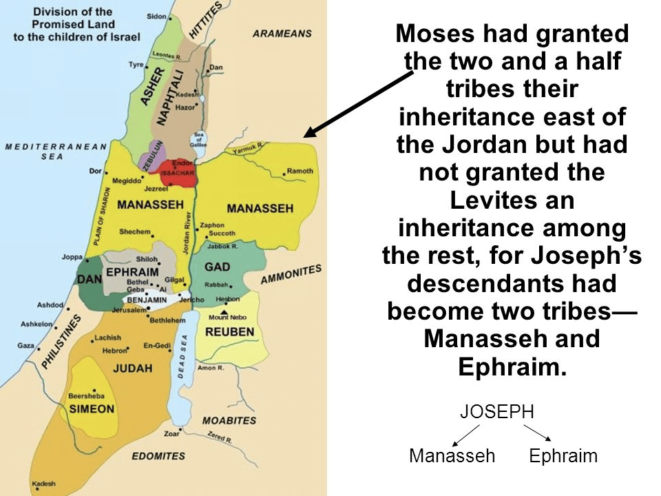 The land captured by Israel, both east and west of the Jordan River, is divided and distributed by lots among twelve tribes. The Levite tribe does not get land, and Joseph gets two parcels of land for his two sons, Ephraim and Manasseh, who become basically 2 of the 12 tribes.