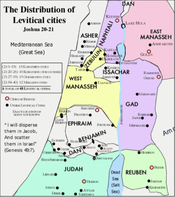 “The priestly tribe of Levi, is given no land because “the LORD God of Israel is their inheritance” (13:33). The tribe of Levi is allotted 48 towns scattered throughout the territory of the other tribes. These towns include the six cities of refuge.