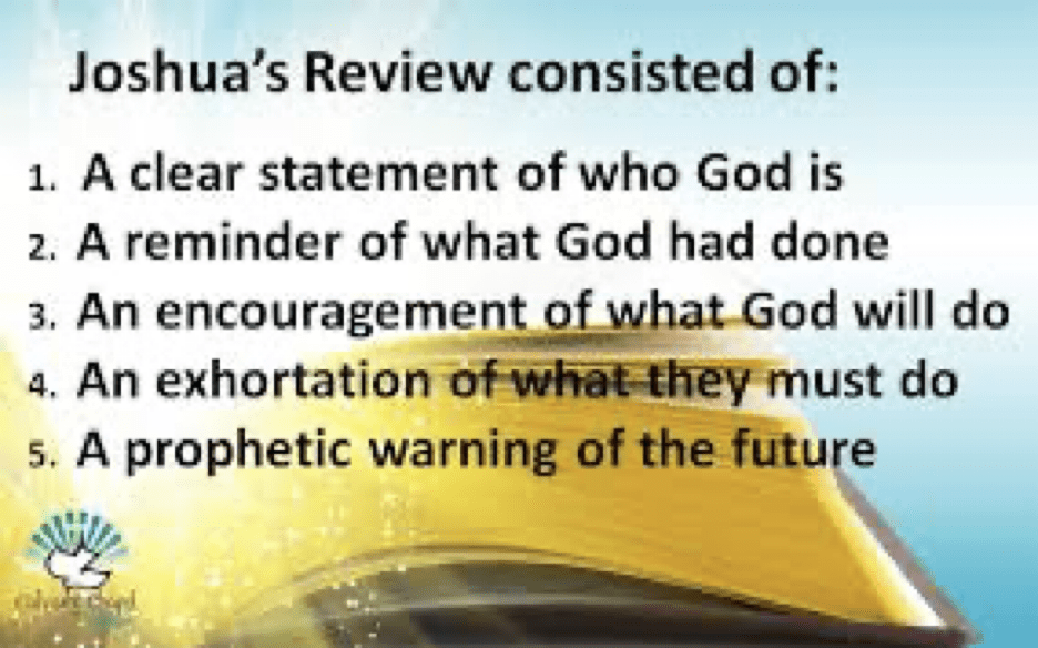 “Joshua has grown old and is about to die. He calls all Israel to him and exhorts them to obey the commands of the book of the law of Moses, so that they might not be enticed by the nations around them to forsake the covenant.”