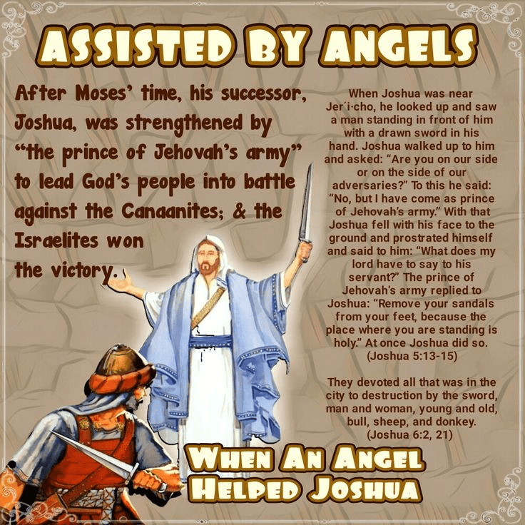 A man wielding a sword, the commander of the Lord’s army , appears to Joshua who falls on his face to the ground and requests instruction.The soldier tells tells Joshua to remove the sandals from his feet, for the ground upon which he is standing is holy. This soldier is probably the angel of the Lord, an appearance of God Himself in human form. He gives Joshua the battle plan for taking Jericho.