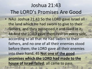 “Not one of all the good promises that the LORD had made to the house of Israel had failed; all came to pass” (21:45). Many today say that Israel never got the land that God promised Abraham, but these verses say that they did.