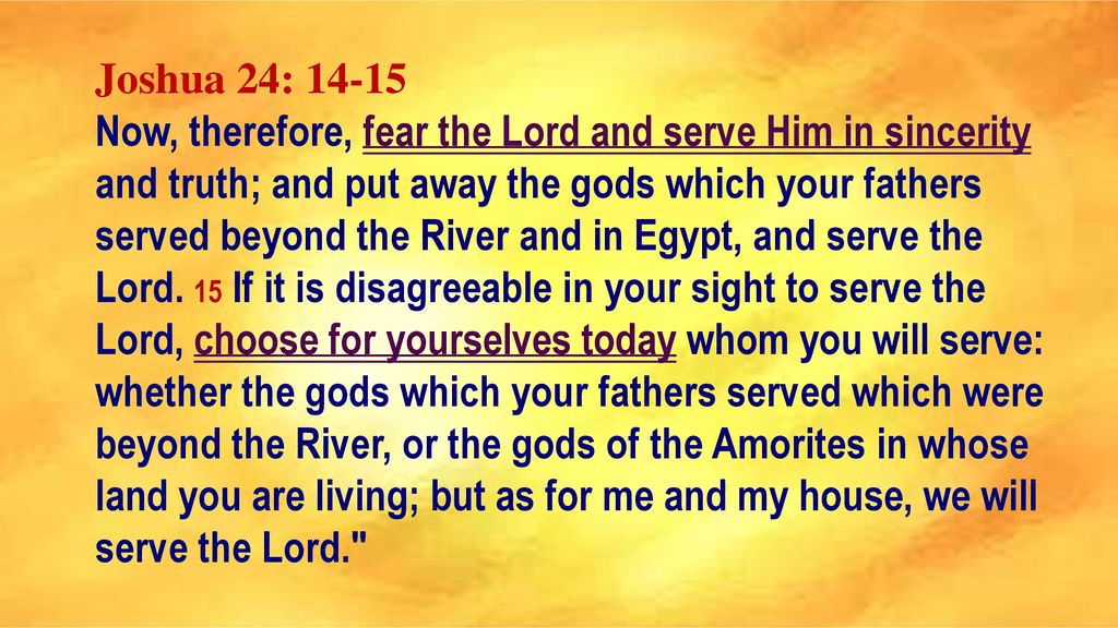 “Joshua calls all Israel to him at Shechem, where he asks them to serve the Lord–the God of Abraham, Isaac, and Jacob–rather than other gods. They reaffirm their allegiance to the Lord, and Joshua makes a covenant with them there, erecting a stone as a memorial of the covenant.”