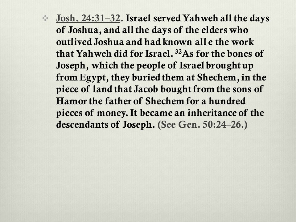 Joshua dies at 110 years of age and is buried in his land The bones of Joseph, which the Israelites brought out of Egypt, are buried at Shechem. The priest Eleazar, son of Aaron, dies and is buried at Gibeah.