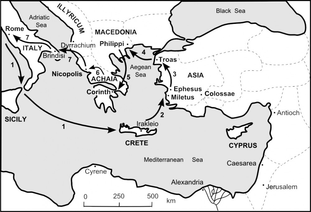 Paul wrote Titus from Macedonia or Ephesus to Titus in Crete (2 Tim 1:5), probably 66 AD. Paul had visited Crete with Titus on his “4th missionary journey (see charts above) and left him there, having seen firsthand the problems. When he wrote the letter to Titus, Paul was on his way to Nicopolis, in Achaia, to spend the winter (3:12), but apparently was arrested in Nicopolis and sent to Rome for his final imprisonment and martydom. He hoped to sent Tychicus to Crete (3:12). He tells them to help Zenas the lawyer and Apollos on their way, so they would be coming to Crete. Just as 1 Timothy, Paul deals with issues of sound doctrine and church order. He tells Titus to “set in order” (1:5) what remains of a church now several years old as his death and the end of the miraculous period approaches, to appoint elders in every “city” with emphasis on men who are able to “exhort in sound doctrine and refute those who contradict”, warns against the Judaizers who preach for money and are “upsetting whole families”, and warns against foolish controversies and disputes about the Law (3:9-10), even rejecting a factious man after 2 warnings. His “sound doctrine” deals not only with heretical teachings, but with healthy (“sound”) Christian living of older men, older women, young women, young men, and slaves, urging all to engage in good deeds b/c of the great saving kindness, love, and grace given them through Jesus Christ. Titus was to teach these things and to reprove with all authority, letting no one disregard him (2:15).
