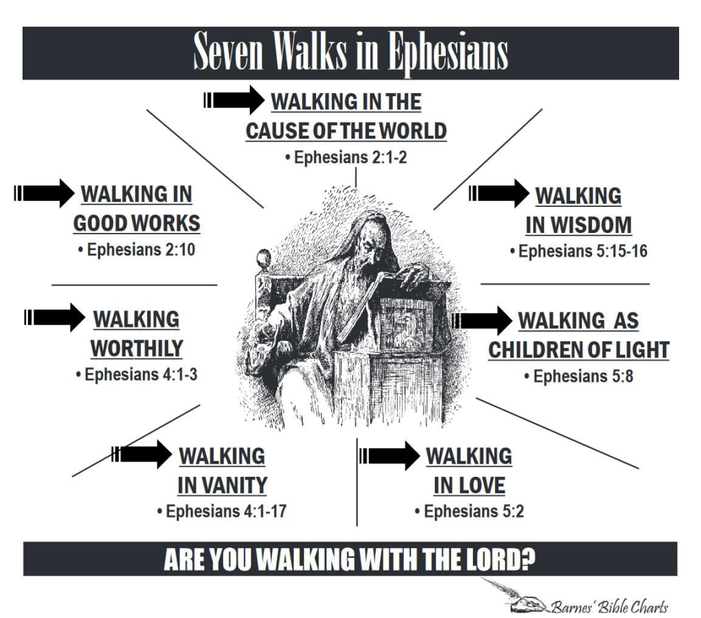 So now that we realize where we are safely seated with Jesus in the heavenly places, how should we live as special children of God. How you walk is simply how you conduct yourself: what you do, think, and say every day 24/7. There are 7 “walks” in Ephesians. 1) 2:1-2 how you walked in sin and lusts before being saved. 2) 2:10 the good works we should walk in as newly created saved by grace children of God.