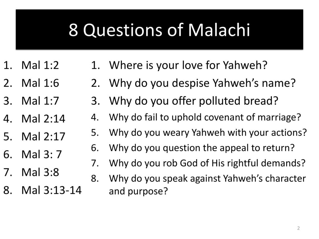 Malachi writes in question/answer form. Notice the 8 times that it says: “But or yet you say”.