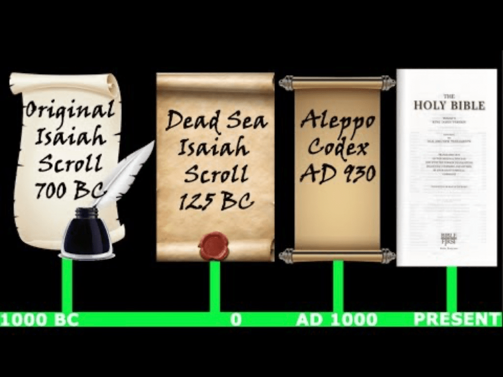 What is this image about? On the left is the original book (scroll) of Isaiah written in Hebrew about 700 BC. We do not have the original. On the far right is the Aleppo Codex copy of Isaiah in 930 AD. This Aleppo Codex copy of Isaiah is the oldest surviving Hebrew copy of Isaiah (there are older ones in different languages) and was done by the Masoretes. The Masoretes were Jewish scribes who from the 6th to the 10th century AD standardized previous Hebrew copies of Scripture for accuracy. The Masoretic text is used as the basis for most of our modern translations.