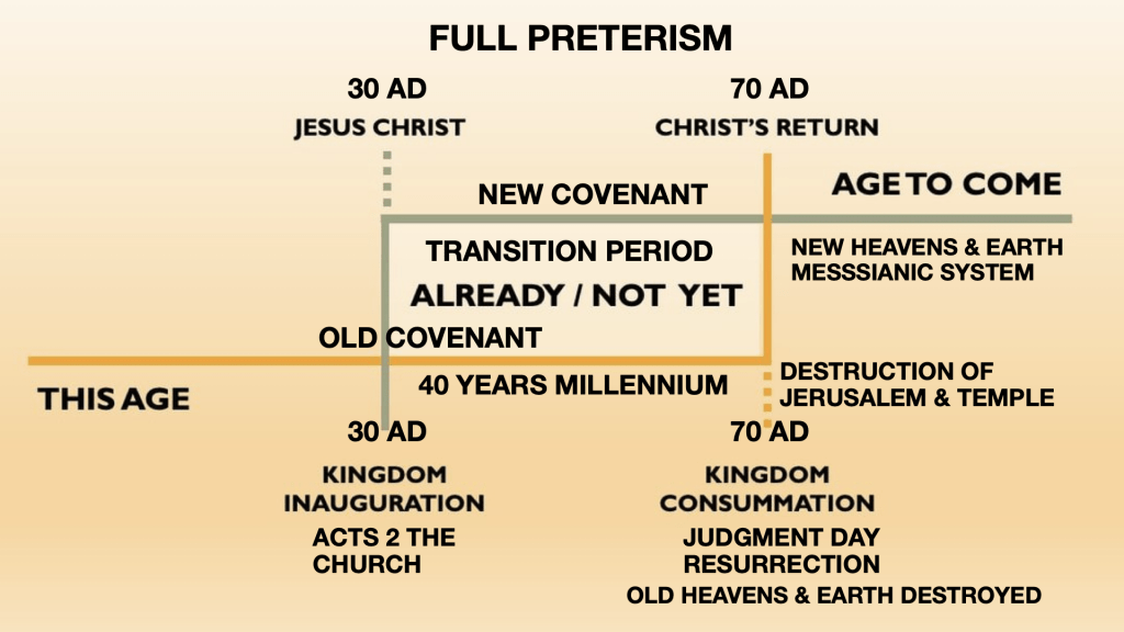 Full preterism is based on Jesus’ 4 predictions that He would return within the lifetime of those he was speaking to: Matthew 10:4; 16:27-28 (where it even says that He is “about to come” (mello which always in the NT means “about to be” and it also says that some whom he was talking to would still be alive when he would come); 24:30-34 he would come before that generation he was talking to would pass away (generation: genea which in the NT always means a 40 year period or the people living in a 40 year period, just like we use the word for baby boomer generation, Gen Z, etc.); 26:64. There are no other predictions by Jesus of any other “coming” after that generation. The apostles and other NT writers also predicted an imminent 2nd coming: James 5:7 the coming of the Lord is near. Hebrews 10:37 He who is coming will come in a very little while and will not delay. Jesus did return in 70 AD using the Romans to judge the Jews and to destroy the temple and the city of Jerusalem. That was his “2nd coming”. There would also be a resurrection of the dead of the OT at the end of the Jewish age in 70 AD as predicted by Daniel 12:1-3. Paul even said that resurrection was “about to happen” (mello again) when he spoke. Peter said that the “end of all things was at hand” in 1 Peter 4:7. If he was predicting an imminent end of the world, then he was a false prophet since that did not happen. What he was predicting was the end of the Law of Moses and the end of the “old heavens and earth” (which is the Jewish system). Hebrews 8:13, written in 60 AD, said that the old covenant was “ready to disappear”, and it did disappear in 70 AD when the temple was destroyed. There has been no temple, animal sacrifices, or priesthood since 70 AD so the Law of Moses and the Jewish system ended in 70 AD. The new covenant of Jesus and the “new heavens and earth” would take the place of the old covenant after 70 AD (Hebrews 12:25-29; 2 Peter 3). The Jews were God’s holy nation and chosen people in the old covenant but that kingdom was taken from them and given to a new spiritual nation, the church (Matthew 21:43) which is made up of Jew and Gentile Christians. The old covenant priesthood was replaced by the priesthood of all believers (1 Peter 2:6-9) who offer up spiritual sacrifices and not animals. Jesus predicted that the kingdom was at hand but he also said that kingdom would not be a physical kingdom like the kingdom of David (John 18:36). It would be a spiritual kingdom, the church, established in Acts 2 and full consummated in 70 AD. There was a transition period from 30-70 AD as the transition was made from the old to the new covenant, just like we have a transition period between the election of a president and the inauguration. The people living in that 40 year transition period already had spiritual blessings, but immortality would only be officially given in 70 AD when Jesus destroyed death (1 Corinthians 15). The book of Revelation was about things to happen “soon” after the time of writing (Rev 21:1-3; 22:5-10). It was written during the reign of the 6th emperor of Rome. Rev 17 says 5 emperors had fallen, i.e. died, and “one is” at the time of writing. That 6th emperor would be Nero who died in 68 AD so the book was written before 70 AD. The book is predicting the destruction of Jerusalem in 70 AD. The theme is God avenging the blood of the apostles, prophets, and saints that was shed by the ungodly, rebellious Jewish harlot nation all through their history (Rev 18). The famous “1000 year millennium” of Rev 20 was just figurative of the 40 year period from 30 AD to 70 AD that ended when the devil was released to get God and Magog (the Romans) to surround and destroy the holy city of Jerusalem (Rev 20).