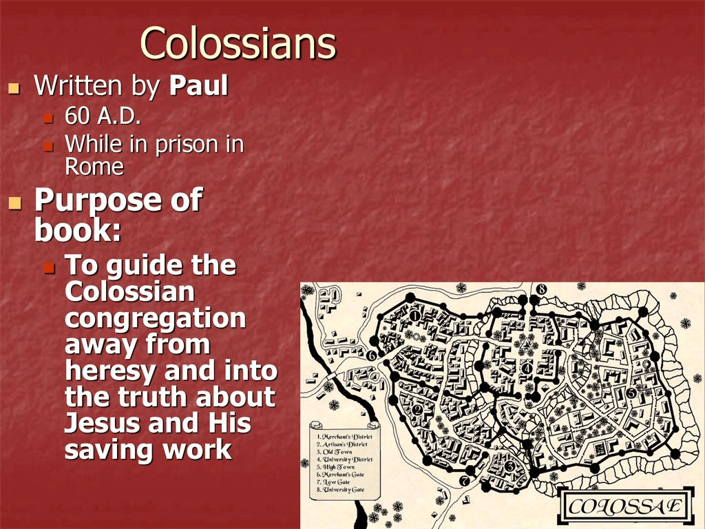 Brief Summary: Colossians was written explicitly to defeat the heresy that had arisen in Colosse, which endangered the existence of the church. While we do not know what was told to Paul, this letter is his response.