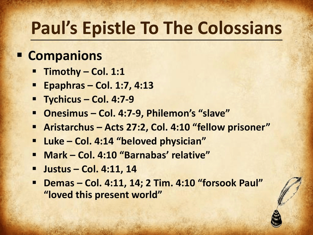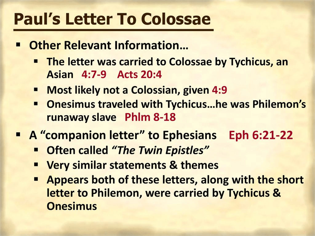 TIME AND PLACE OF WRITING: Colossians is one of Paul’s four “prison epistles” (Col 4:18.; cf. Ephesians, Philippians, and Philemon). The general consensus is that these epistles were written during Paul’s imprisonment at Rome (cf. Ac 28:16,30-31). If such is truly the case, then Paul wrote Colossians around 61-63 A.D. from Rome. The indication is that the epistles to the Colossians, Philemon and the Ephesians were carried to their destination by Tychicus and Onesimus (cf. Col 4:7-9; Phile 10-12.; Eph 6:21-22).