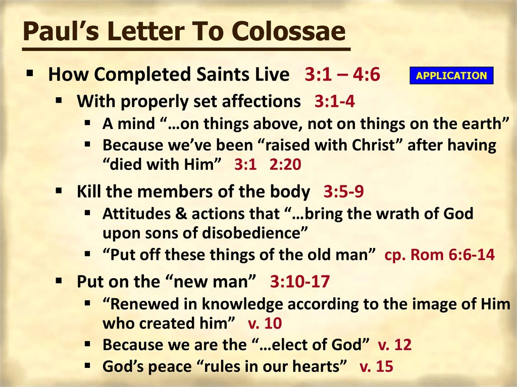 Practical Application: Although Paul addresses many areas, the basic application for us today is the total and complete sufficiency of Christ in our lives, both for our salvation and our sanctification. We must know and understand the gospel so as not to be led astray by subtle forms of legalism and heresy. We must be on guard for any deviation that would diminish the centrality of Christ as Lord and Savior. Any “religion” or cult that tries to equate itself with the truth using books that claim the same authority as the Bible, or which combines human effort with divine accomplishment in salvation must be avoided. Other religions cannot be combined with or added to Christianity. Christ gives us absolute standards of moral conduct. Christianity is a family, a way of life, and a relationship—not a religion. Good deeds, astrology, occultism and horoscopes do not show us God’s ways. Only Christ does. His will is revealed in His word, His love letter to us; we must get to know it!