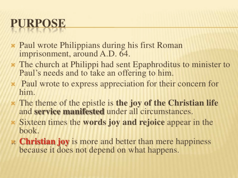 PURPOSE OF THE EPISTLE: The church at Philippi had sent a gift to Paul in Rome by the hand of Epaphroditus (Phl 4:10,18). Paul uses this occasion not only to thank them, but to comfort them concerning his situation as a prisoner for Jesus Christ (Phl 1:12-14). He also writes of his plans to send Timothy soon (Phl 2:19-24), and why he considered it necessary to send Epaphroditus back to them (Phl 2:25-30). There may have also been a problem at Philippi involving two women, for Paul has a few words to say concerning them (Phl 4:2-3).