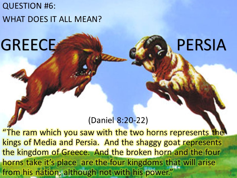 But there’s more. In Daniel 8, in the 3rd year of Belshazzer (554 BC), Daniel saw a vision of a ram and a goat. The ram had 2 horns (Media and Persia) and conquered everything. The goat came flying from the west and defeated the ram. The goat had a “prominent horn” between his eyes. But after the prominent horn became great, it was broken and 4 prominent horns came up in its place. Then Daniel actually tells who the ram and the goat are, i.e. the Medo-Persian ram and the Grecian goat. The prominent horn has to be Alexander the Great. The 4 kingdoms that form from the broken prominent horn has to be the division of Alexander’s might empire into 4 smaller kingdoms after his death in 323 BC. The vision, as in Daniel 7, predicts a “little horn” that would claim to be equal to God and would destroy the sanctuary (the temple in Jerusalem). That, as in Daniel 7, would have to be Titus who destroyed Jerusalem in 70 AD. So this propphecy in Daniel 8 goes all the way down to 70 AD which would be 624 years in the future.