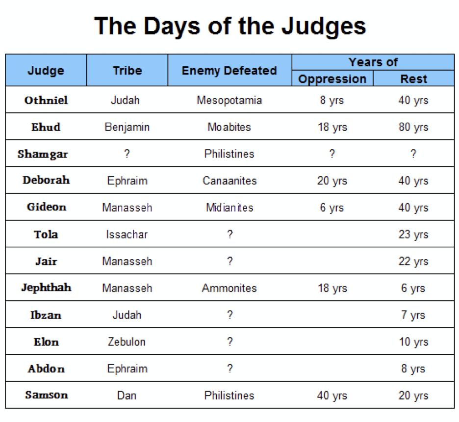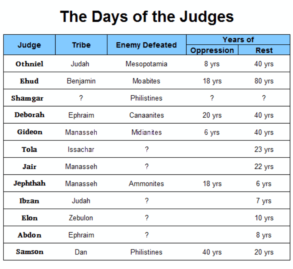 Here is a summary of the different Canaanite oppressions, the judges whom God raised up, and years of rest each judge provided Israel before the cycle repeated itself. The total period of the Judges probably around 300 years with some of the judges overlapping.