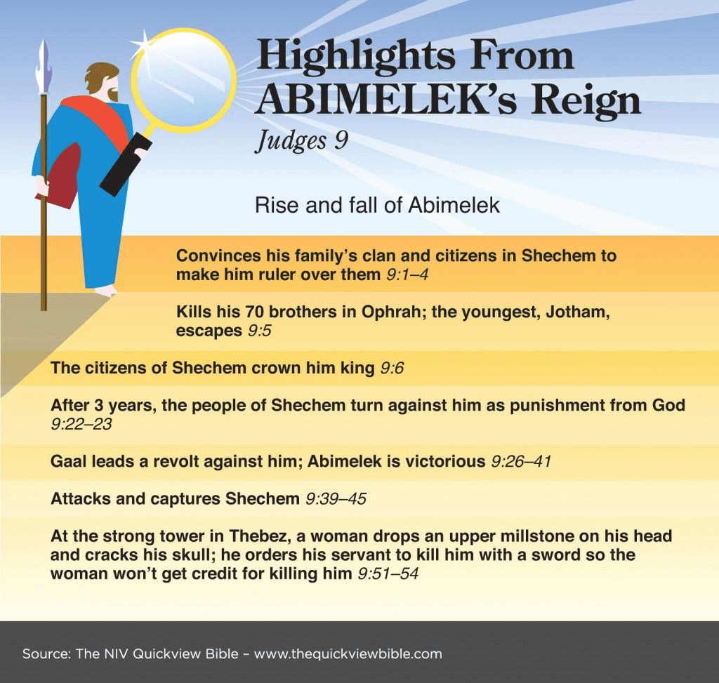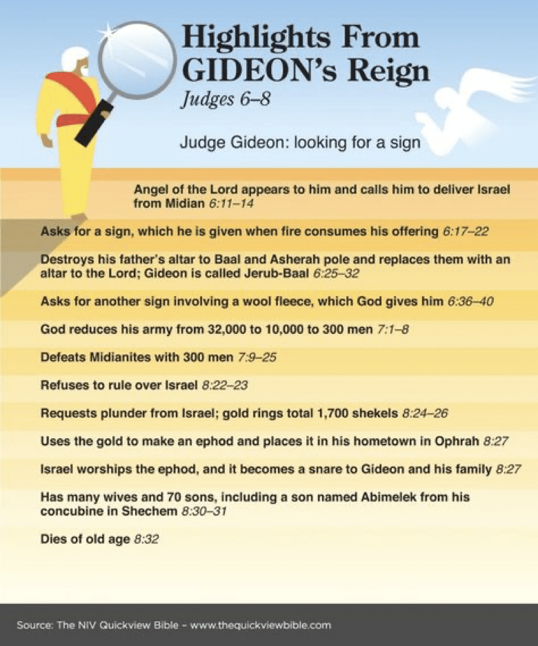 Not much on the first 3 judges. The 1st judge Othniel (Caleb’s younger brother) “killed the Mesopotamian king Cushan-rishathaim. The 2nd judge Ehud killed the Moabite king Eglon after 18 years of Moabite oppression. He went to Eglon, pretending to have a secret message from God. Eglon cleared the room. Ehud was left handed, so picture him putting his right hand up to his mouth as if giving a secret message in the ear of Eglon, while he pulled out an 18″ double edged sword that he had hidden on his right thigh under his clothes. Eglon’s servants had not done a good job searching Ehud for weapons. Eglon was very fat. Ehud stuck the 18” sword so deep into Eglon’s belly that the sword was no longer visible in the fat. Ehud sneaked out. Ehud’s servants delayed entering the room, thinking the king was “relieving himself in the closet of his cool chamber”. The delay allowed Ehud time to escape. He mounted an army and defeated the Moabites. The 3rd judge Shamgar is known for killing 600 Philistines with an oxgoad (a long stick with a pointed end used to prod oxen along). Kinda like Samson killed 1,000 Philistines with the jawbone of a donkey.